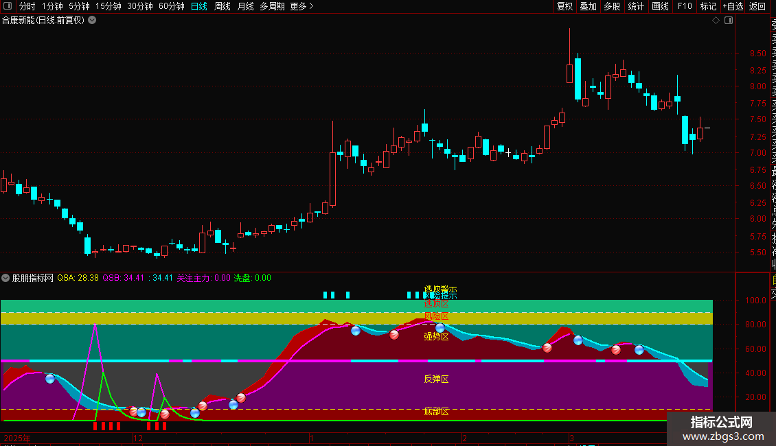 STICKLINE(C>0,0,10,5,0),COLOR00008A; STICKLINE(C>0,10,50,5,0),COLOR63006A; STICKLINE(C>0,50,80,5,0),COLOR657600; STICKLINE(C>0,80,90,5,0),COLOR00BBBB; STICKLINE(C>0,90,100,5,0),COLOR79B715; 趋势A:=SMA(((CLOSE-LLV(LOW,28))/(HHV(HIGH,28)-LLV(LOW,28))*100),3,1) ,COLORGREEN,LINETHICK2; DRAWBAND(趋势A,RGB(110,0,20),50,RGB(60,60,60)); IF(趋势A>REF(趋势A,1), 趋势A,DRAWNULL), COLORRED,LINETHICK2; 趋势B:=SMA(趋势A,3,1),COLOR00FFFF, LINETHICK2; QSA:趋势A; QSB:趋势B; DRAWBAND(QSA,RGB(180,0,0),QSB,RGB(0,150,180)); IF( 趋势A>趋势B,趋势B,DRAWNULL), COLORFF00FF, LINETHICK2; IF( 趋势A<趋势B,趋势B,DRAWNULL) ,COLORFFFF00,LINETHICK2; RSV:=(CLOSE-LLV(CLOSE,9))/(HHV(CLOSE,9)-LLV(CLOSE,9))*100; K:=SMA(RSV,3,1); D:=SMA(K,3,1); TYP:=(HIGH+LOW+CLOSE)/3; CCI:=(TYP-MA(TYP,14))/(0.015*AVEDEV(TYP,14)); DIFF:=EMA(CLOSE,2)-EMA(CLOSE,55); DEA:=EMA(DIFF,6); MACD:=2*(DIFF-DEA); 拐点:=IF(K>D AND CCI>0 AND DIFF>DEA AND MACD>0,1,0); STICKLINE(拐点=1,49,51,4,0),COLORFF00FF; STICKLINE(拐点=0,49,51,4,0),COLORCYAN; VR2:=REF(LOW,1); VR3:=SMA(ABS(LOW-VR2),3,1)/SMA(MAX(LOW-VR2,0),3,1)*100; VR4:=EMA(IF(CLOSE*1.3,VR3*10,VR3/10),3); VR5:=LLV(LOW,30); VR6:=HHV(VR4,30); VR7:=IF(MA(CLOSE,58),1,0); VR8:=EMA(IF(LOW<=VR5,(VR4+VR6*2)/2,0),3)/618*VR7; VR9:=IF(VR8>100,100,VR8); 关注主力:IF(VR9>-150,VR9,0),COLORFF00FF,LINETHICK2; 洗盘:IF(VR9<REF(VR9,1),VR9,0),COLORGREEN,LINETHICK2; DRAWICON(CROSS(趋势A,趋势B),趋势A,13); DRAWICON(CROSS(趋势B,趋势A),趋势B,14); DRAWICON(CROSS(90,趋势A),98,12); STICKLINE(趋势A>=90,102,112,1,0),COLOR00FFFF; STICKLINE(趋势A>=80,102,107,1,0),COLORFFFF00; STICKLINE(趋势A<=10,-1,-7,1,0),COLOR0000FF; STICKLINE(C>0,90,90,2,0),COLORDDDDDD; STICKLINE(C>0,80,80,2,0),COLORDDDDDD; STICKLINE(C>0,10,10,2,0),COLOR00DDDD; DRAWTEXT(CURRBARSCOUNT=38,8,'底部区'),COLOR00FFFF; DRAWTEXT(CURRBARSCOUNT=38,35,'反弹区'),COLOR00FFFF; DRAWTEXT(CURRBARSCOUNT=38,70,'强势区'),COLOR00FFFF; DRAWTEXT(CURRBARSCOUNT=38,87,'风险区'),COLOR0000FF; DRAWTEXT(CURRBARSCOUNT=38,97,'逃顶区'),COLOR0000FF; DRAWTEXT(CURRBARSCOUNT=38,104,'风险提示'),COLORFFFF00; DRAWTEXT(CURRBARSCOUNT=38,110,'逃顶警示'),COLOR00FFFF;