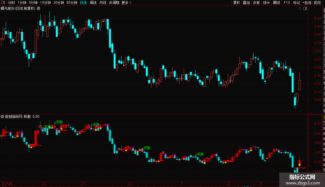 DRAWTEXT(CROSS(REF(A4,1),C) AND A4,H,'↓开跌'),COLORGREEN;
