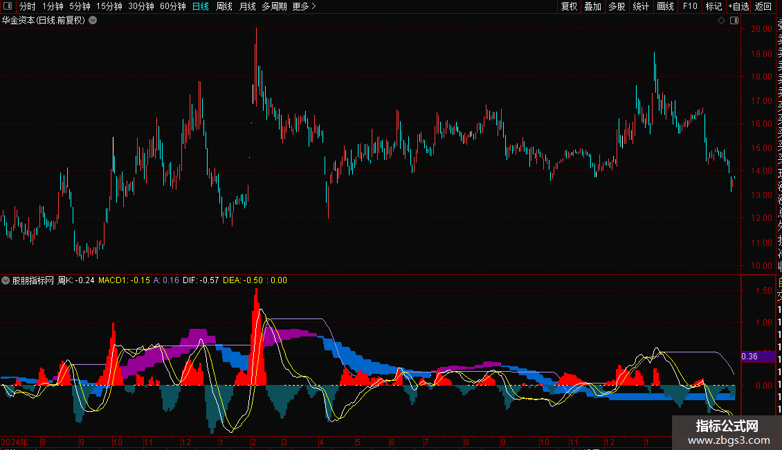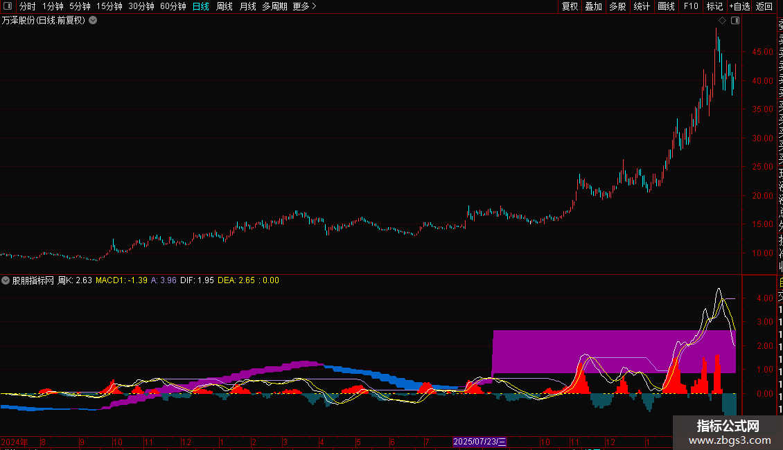 一个太普通的MACD指标引用了周线数据。色带是周MACD,其他显示是平常的日线MACD。操作选票时只看周MACD红色多头的,再看看是否有题材风口点火,以日线MACD刚变红,DiF线零上为进场点。坚持下去正收益没问题的。看长做短安全第一!指标好不好关键看你怎么用了。
