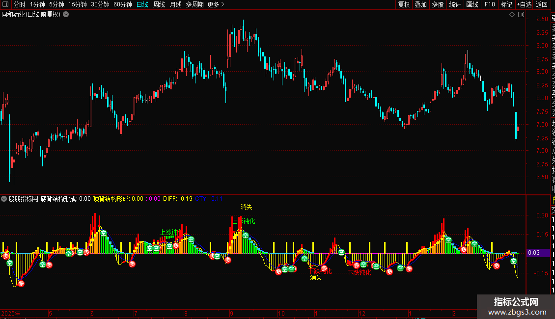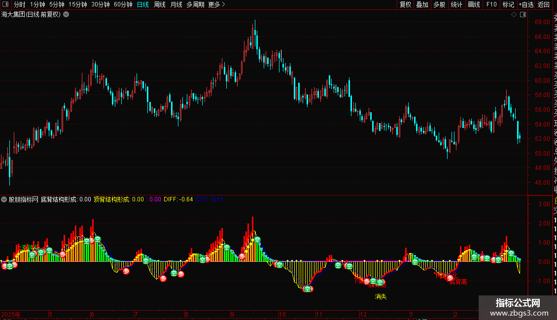 TG:=((MDIFT2<REF(MDIFT2,1))*REF(直接顶背离,1)) OR ((MDIFT3<REF(MDIFT3,1))*REF(隔峰顶背离,1)),NODRAW;