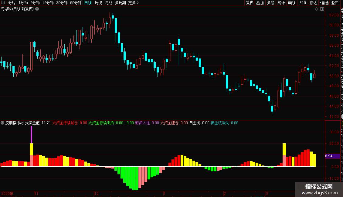 STICKLINE(大资金值<0 AND XA_4<0,0,大资金值,3,0),COLORGREEN;