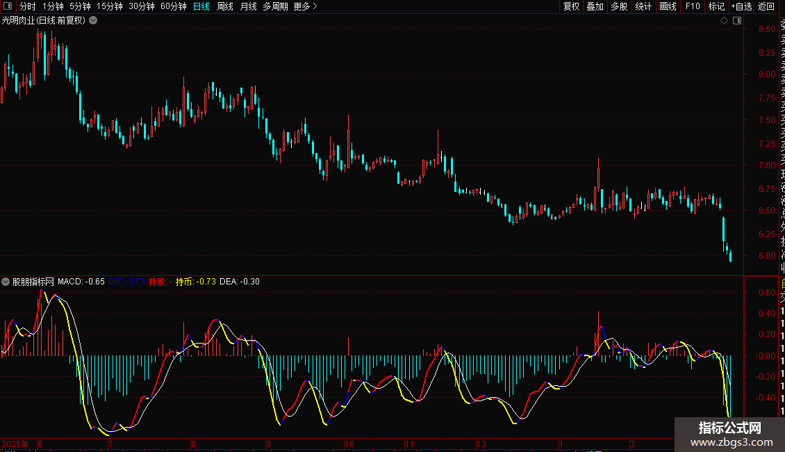 持币:IF(DIF<REF(DIF,1),DIF,DRAWNULL),COLORYELLOW,LINETHICK2;