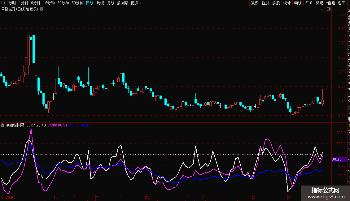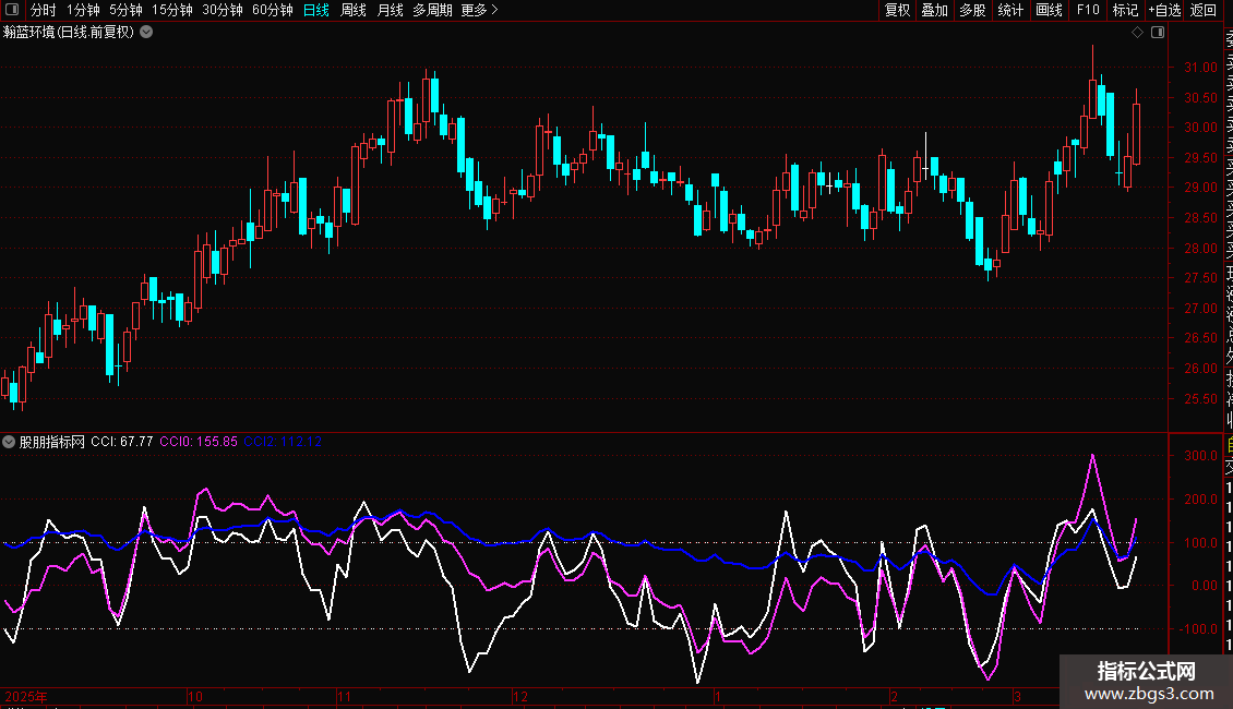 CCI3:=(TYP-MA(TYP,95))/(0.015*AVEDEV(TYP,95)),COLORLICYAN,LINETHICK2;