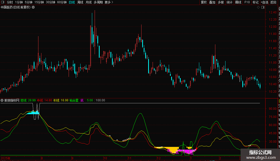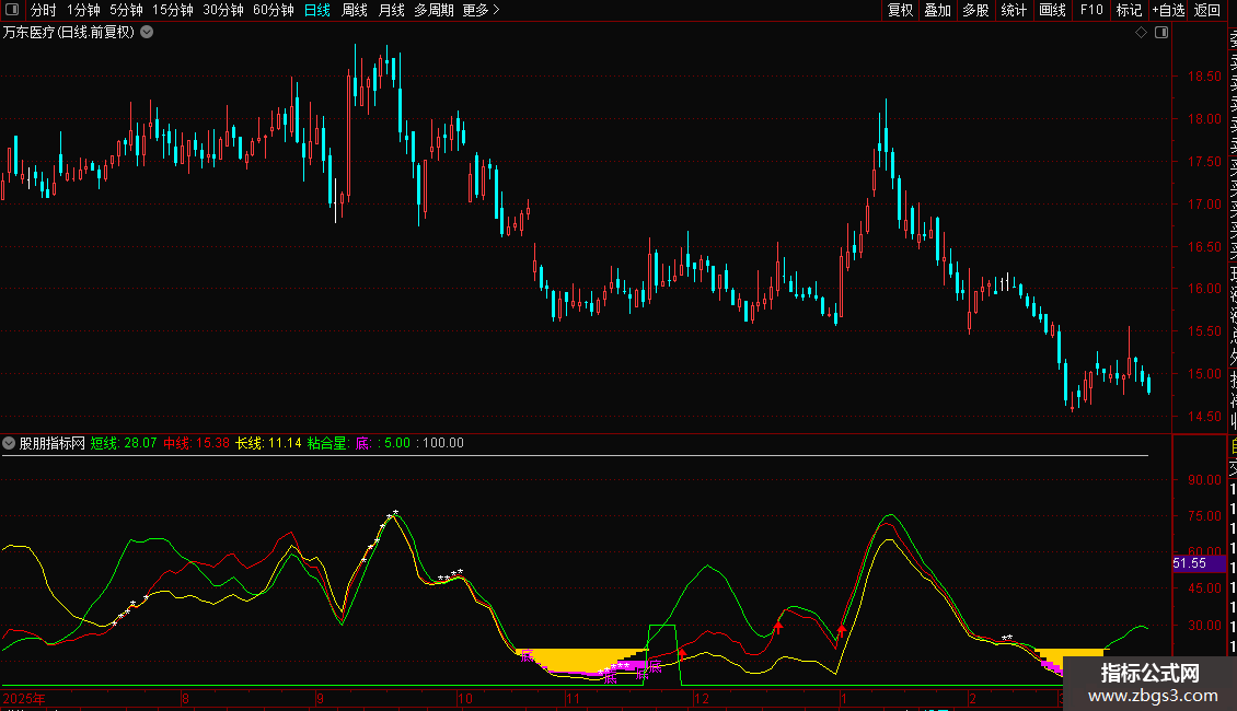 底:DRAWTEXT(CROSS(中线2,-90) AND (长线<中线 AND 长线>REF(长线,1)OR 短线<20 AND 中线<20 AND 长线<20),长线,'底'),COLORFF00FF;