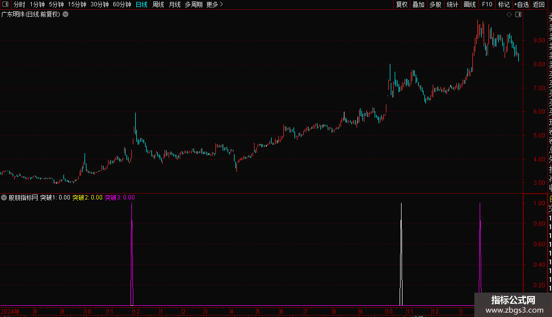 突破25:=REF(COUNT(C/REF(C,1)>1.099,3)<1,1) AND REF(O,2)<REF(H,3) AND C/O>1.037 AND C>=REF(C,3) AND C>REF(C,1) AND C>REF(C,2) AND C/O>REF(C/O,1) AND ((REF(L,2)<REF(H,3) AND REF(C/O>1.0267 AND C/REF(C,1)>1.027,5) AND (REF(C>O,3) OR (REF(C<O,3) AND C>REF(O,3))) AND REF(C/O,4)<REF(C/O,5) AND REF(C/O<1.04,4)));