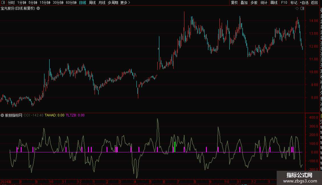 CCI:(X_1-MA(X_1,14))/(0.015*AVEDEV(X_1,14)),COLOR456456,LINETHICK2;