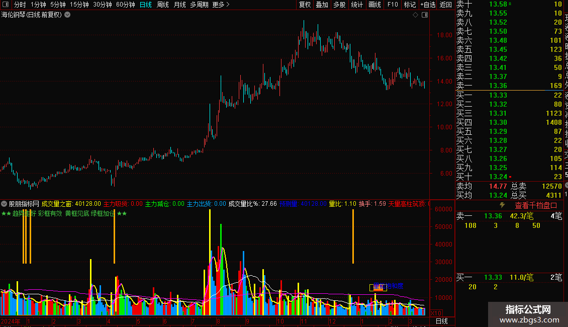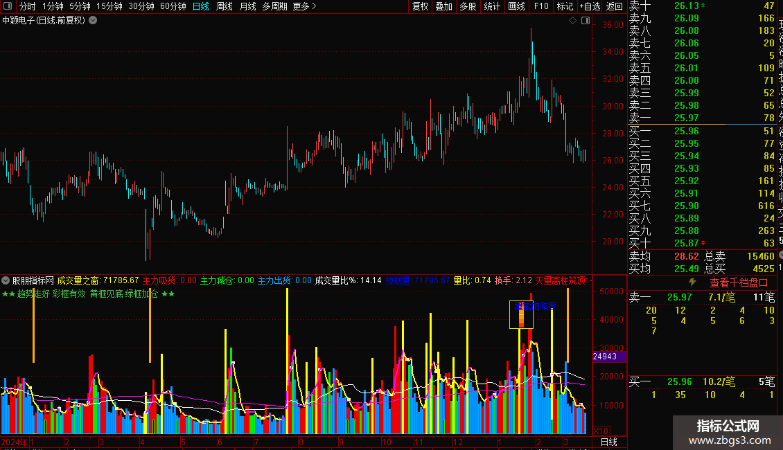 当满足条件天量高柱筑顶>=1时,在0和成交量(手)位置之间画柱状线,宽度为2,0不为0则画空心柱.,画黄色
