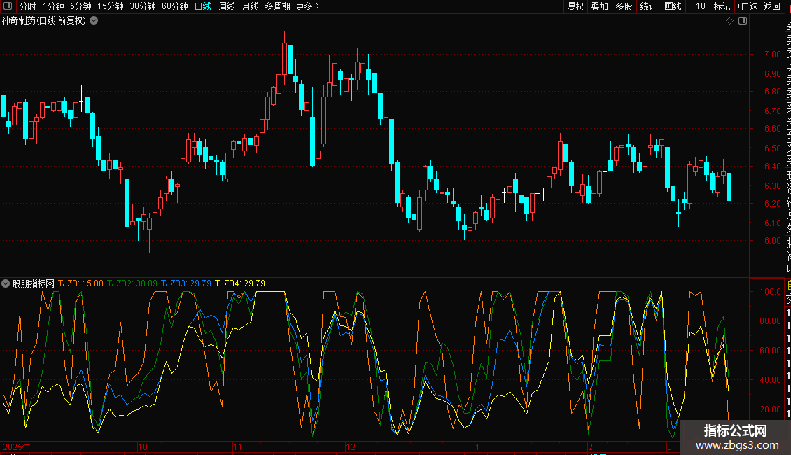 由于有上下边界的技术指标在接近边界(95以上,5以下)地方钝化,图形不直观,方向性不强。能否改善这个区间,让指标的方向性更强。笔者选用了WR和RSI指标配搭,以0-100为上下界,50为中轴,上强下弱。区间(5-95)用法同RSI。由于有上下界的局限,计算时将强弱势区间(95-100,0-5)的指标值取100或0。这样使单边趋势运行的股票在持续上涨时候指标在100走平,反之在0走平。将一般技术指标的钝化表达为趋势,看起来更加直观。取5,10,20,30日来研判走势。软件中的投机指标分别用红、黄、蓝、白四线代表5日、10日、20日、30日投机指标。TJ5、TJ10、TJ20、TJ30后面的数值,则分别是四种周期投机指标当前的数值。