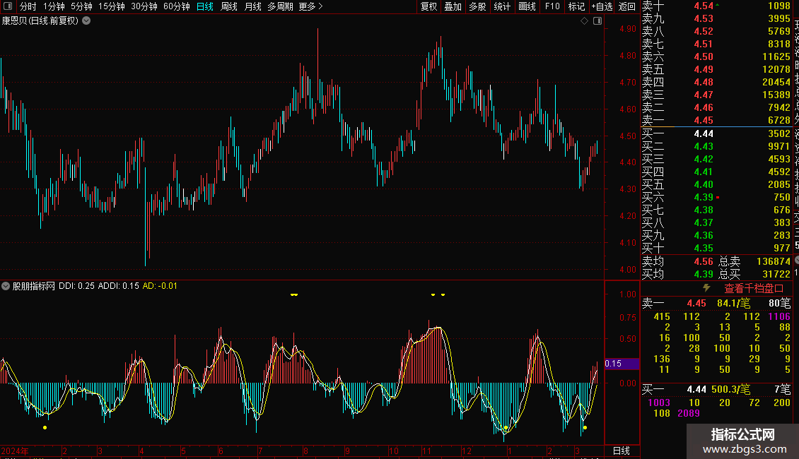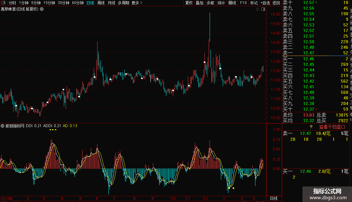 DDI柱状线,由正变负,卖出信号;由负变正,买入信号。