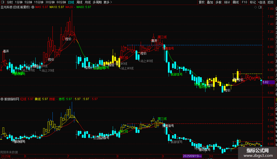 DRAWTEXT(O <= MA(C,60) AND MA(C,60) <= C , L, '↖站上60线'),COLORGRAY;