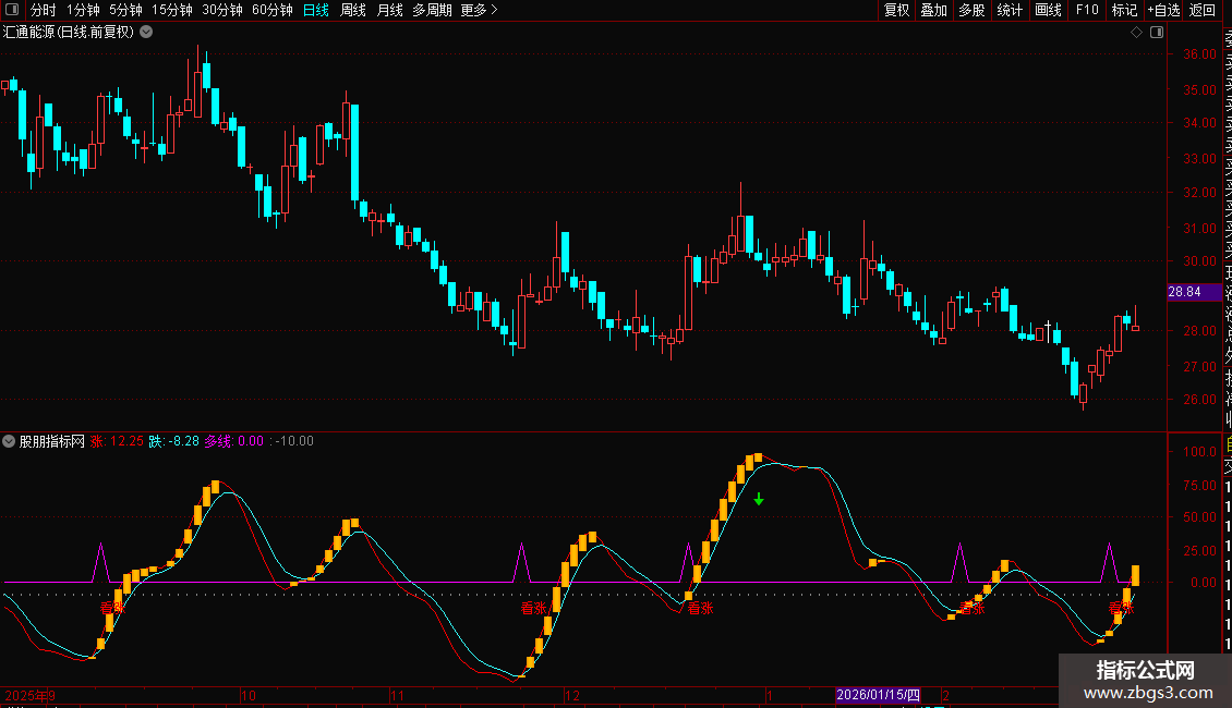 多线:IF(CROSS(涨,跌) AND 跌<-10,30,0),LINETHICK1,COLORFF00FF;