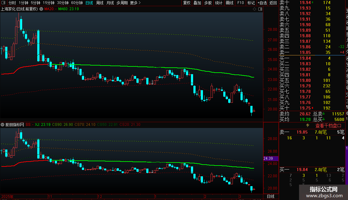 此主图由一根趋势线加四条定位线组成,红色粗线是上升趋势,绿色是下降趋势,可以看到比较强的支撑与压力,虚线是筹码成本线,可以看出筹码走向。如果需要看比较久的K线,需要设置不复权才会准确。