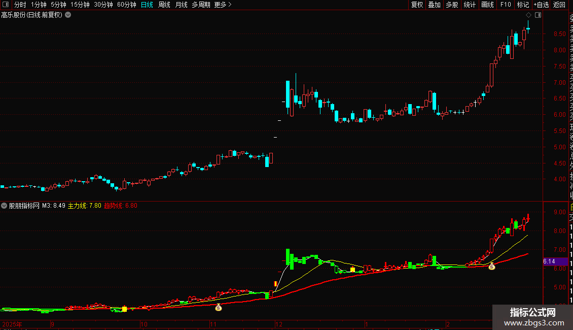 金叉共振:=IF(CROSS(周DIF,周DEA)*BA,MACD+0.1,0)*X3,COLORWHITE,LINETHICK2;