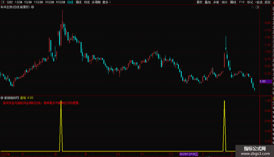 DRAWTEXT_FIX(1,0.01,0.01,0,'游资资金与超级资金同时出现,意味着多方都有拉升的意愿.'),COLORRED;