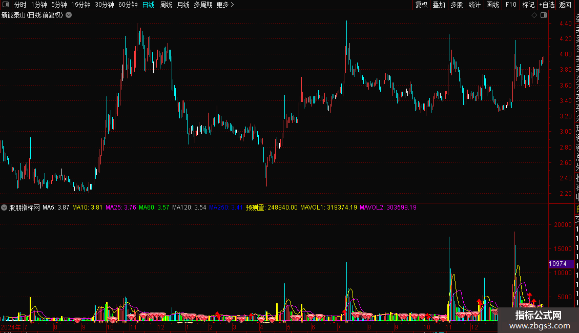 预测量:IF(CURRBARSCOUNT=1 AND PERIOD=5,VOL*240/FROMOPEN,VOL),VOLSTICK;