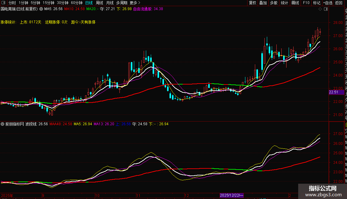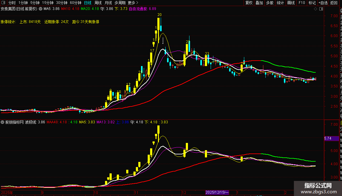 波段线:(MA(CLOSE,3)+MA(CLOSE,6)+MA(CLOSE,12)+MA(CLOSE,24))/4,COLORWHITE,LINETHICK2;