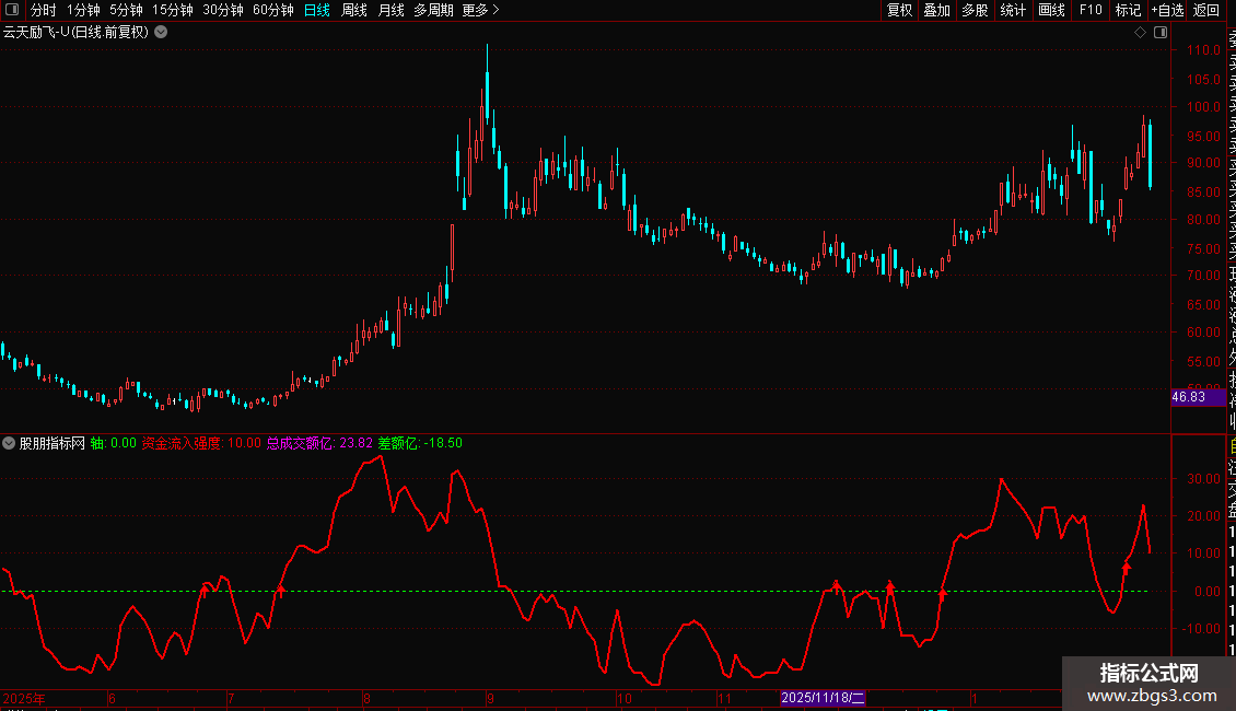 资金流入上穿0轴时买入,资金流入下穿0轴时必须卖出。