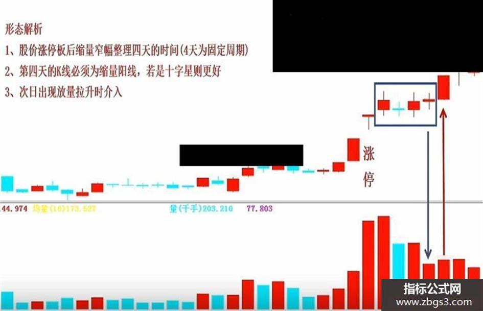 形态解析1、股价涨停板后缩量窄幅整理四天的时间(4天为固定周期)2、第四天的K线必须为缩量阳线,若是十字星则更好3、次日出现放量拉升时介入