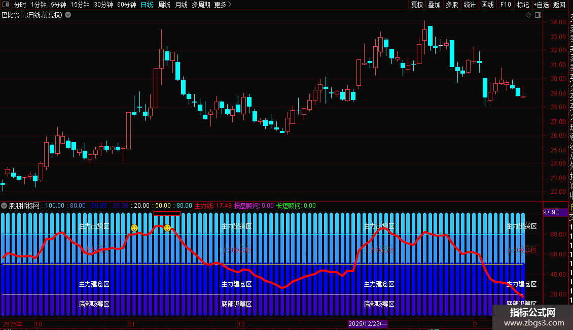 DRAWTEXT(FILTER(CLOSE>0,25),10,'底部吸筹区'),, COLORWHITE;