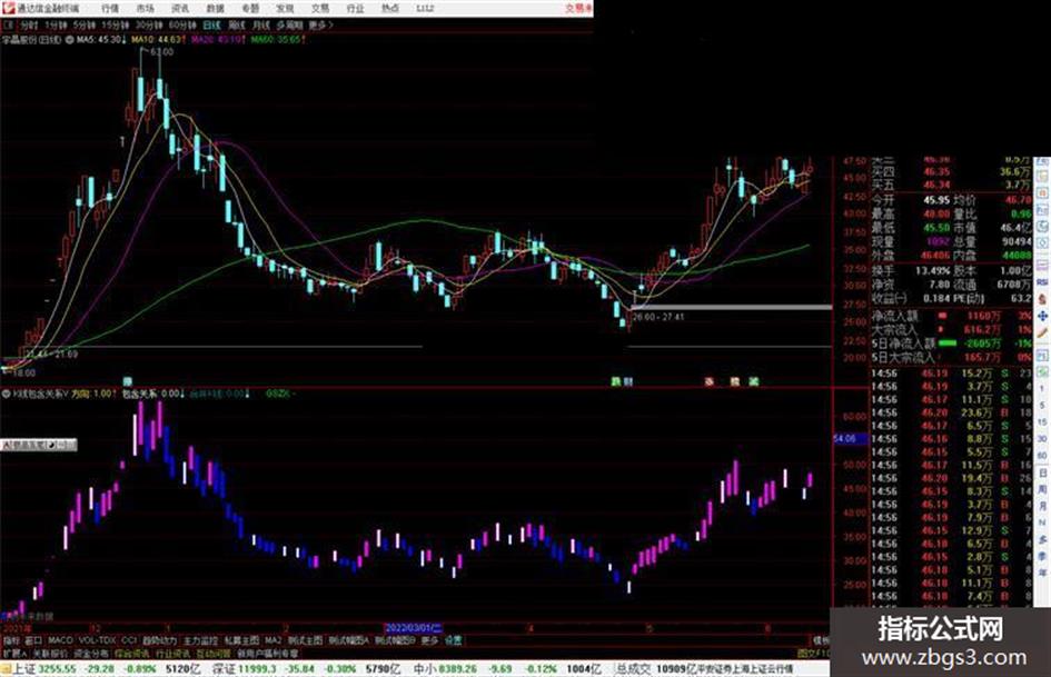 走势K线的包含关系显示,可以从公式中看到,出现包含关系出现时,公式会把相互包含的第二根K线处理成包含处理后的K线区间;向上包含处理时,会把包含形成后的新K线显示为粉红色,向下包含处理时,会把包含形成后的新K线显示为绿色。
