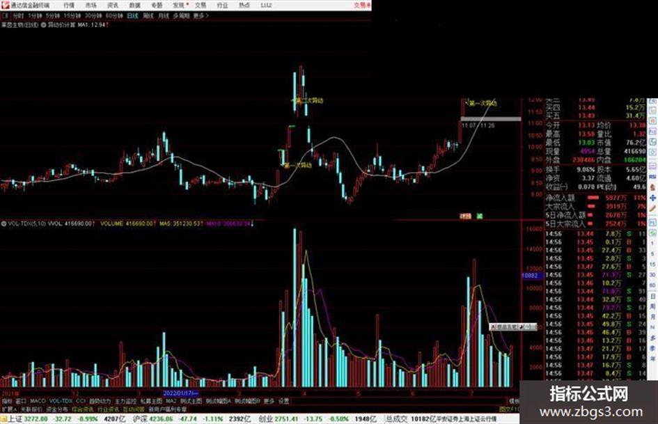 {DRAWNUMBER(PERIOD=5,L-0.2,第二次异动),COLORGREEN;}