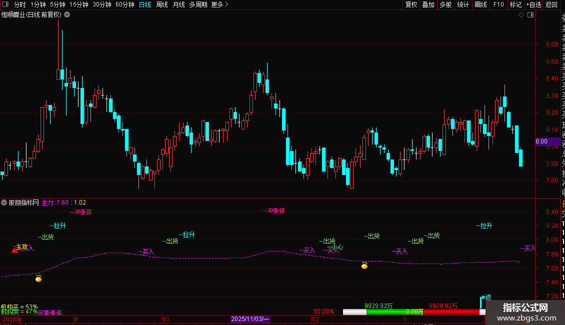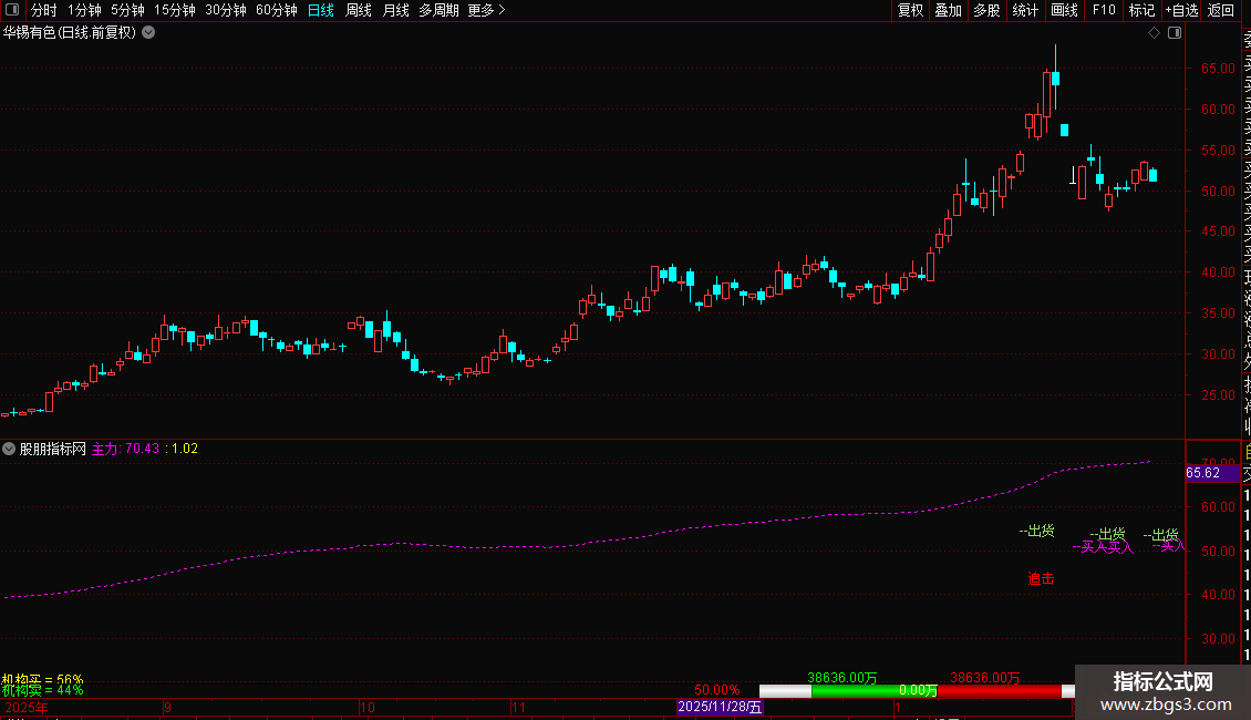 主力线:=EXPMA((CLOSE/VBNH),60)*1,COLORMAGENTA,LINETHICK2;