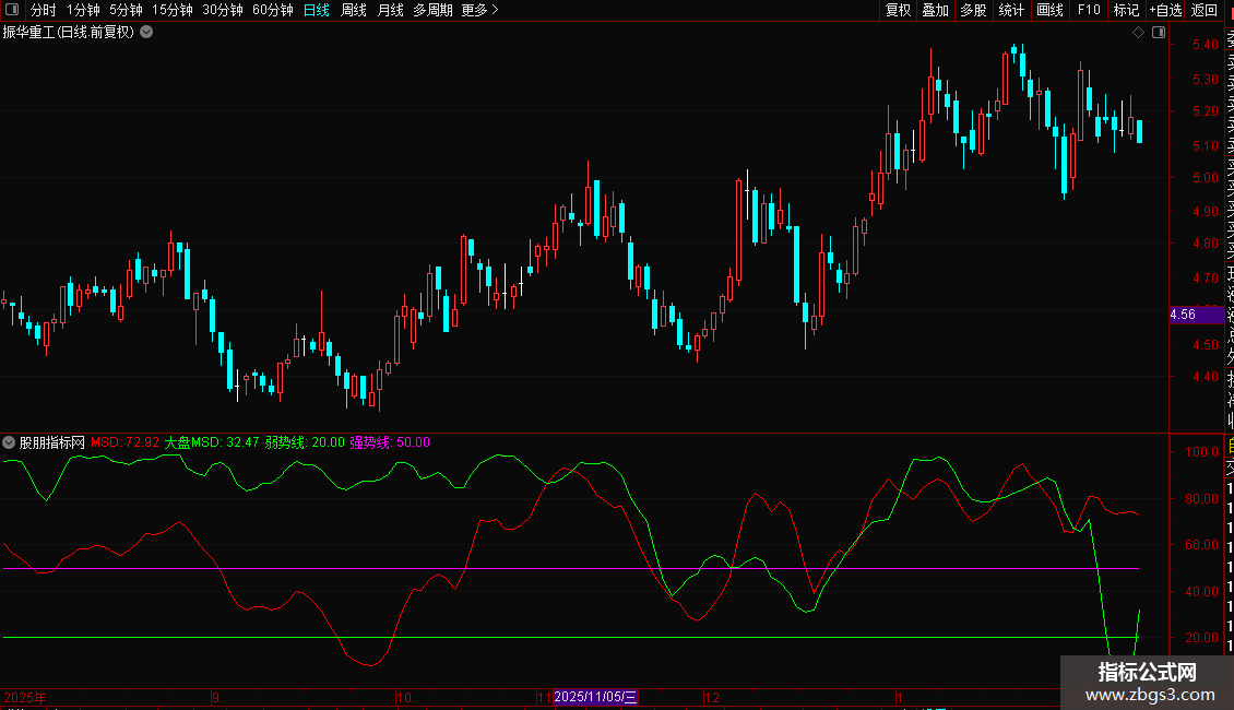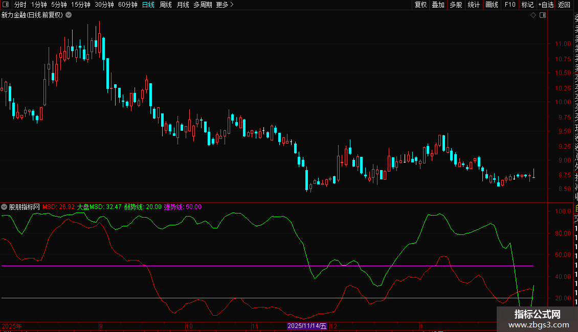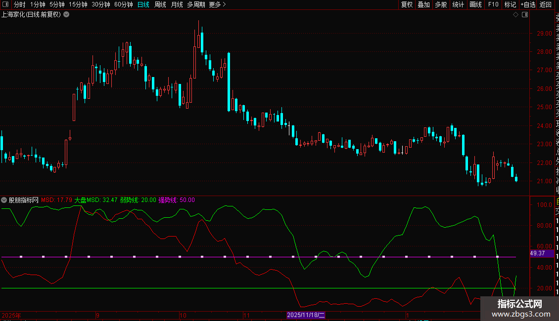 强势线(50,洋红色): 强弱分界线。