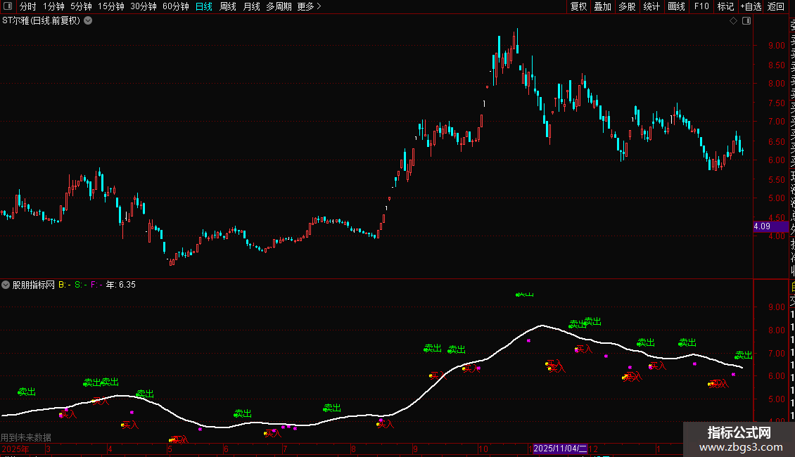 信号基于`ZIG`函数,该函数具有未来函数特性,信号可能随最新价格变动而偏移或消失,适用于复盘分析,实盘使用时需谨慎。