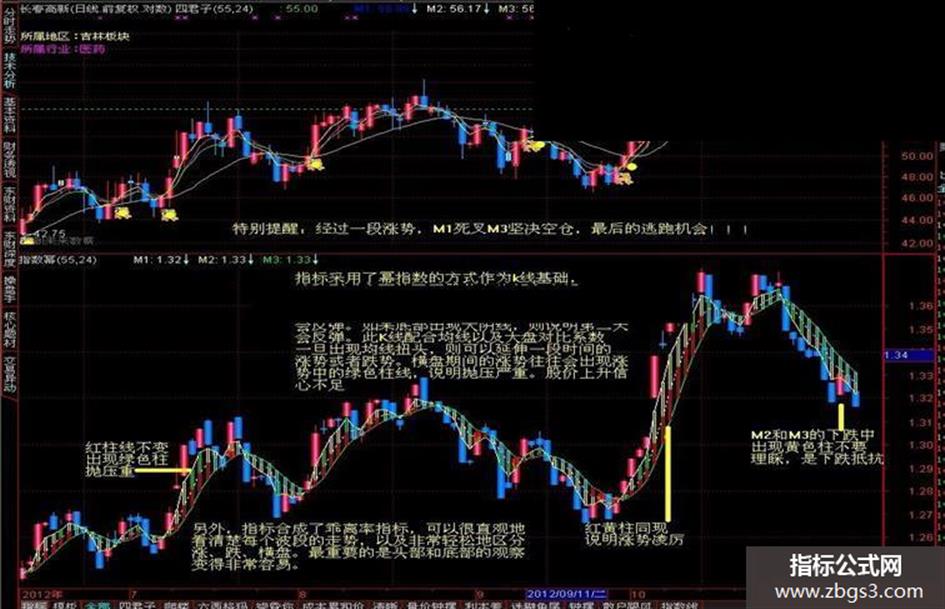 使用中请多注意柱线颜色等变化,比如:M2和M3之间的红柱线与M1与M2之间的黄色柱线叠加,则说明涨势坚决,上档抛压很轻,股价拉高速度快。但下面红柱,上面绿柱意思说上档抛压比较严重,股价上涨很吃力。尤其是在顶部,出现绿色柱线,则说明有大量的股票在抛卖(庄家出货)。