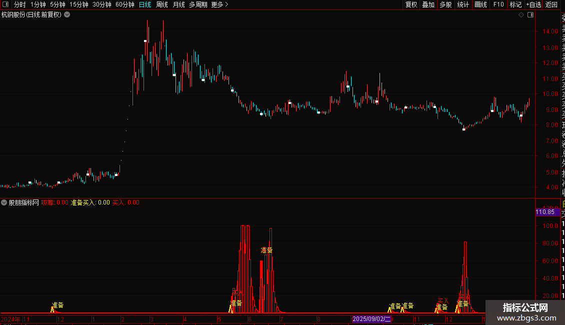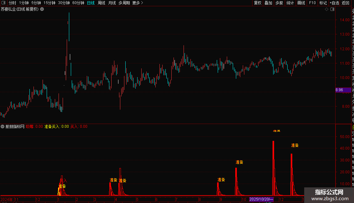3. 买入信号:当吸筹线突破阈值10且趋势向上时,发出明确买入信号。