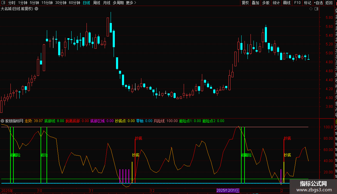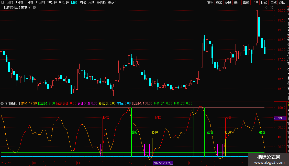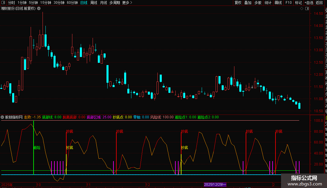 - 底部信号:当走势线突破0轴或8线时,显示“抄底”提示