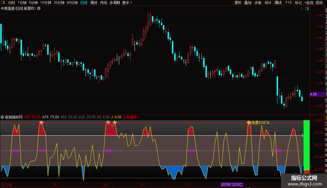 2. 用带状色块和水平线划分出超买(75 以上)、中间区(25-75)、超卖(25 以下)区域。