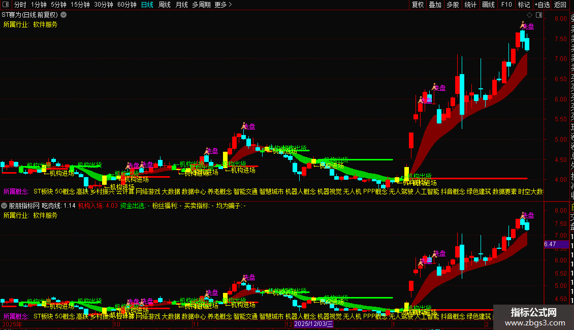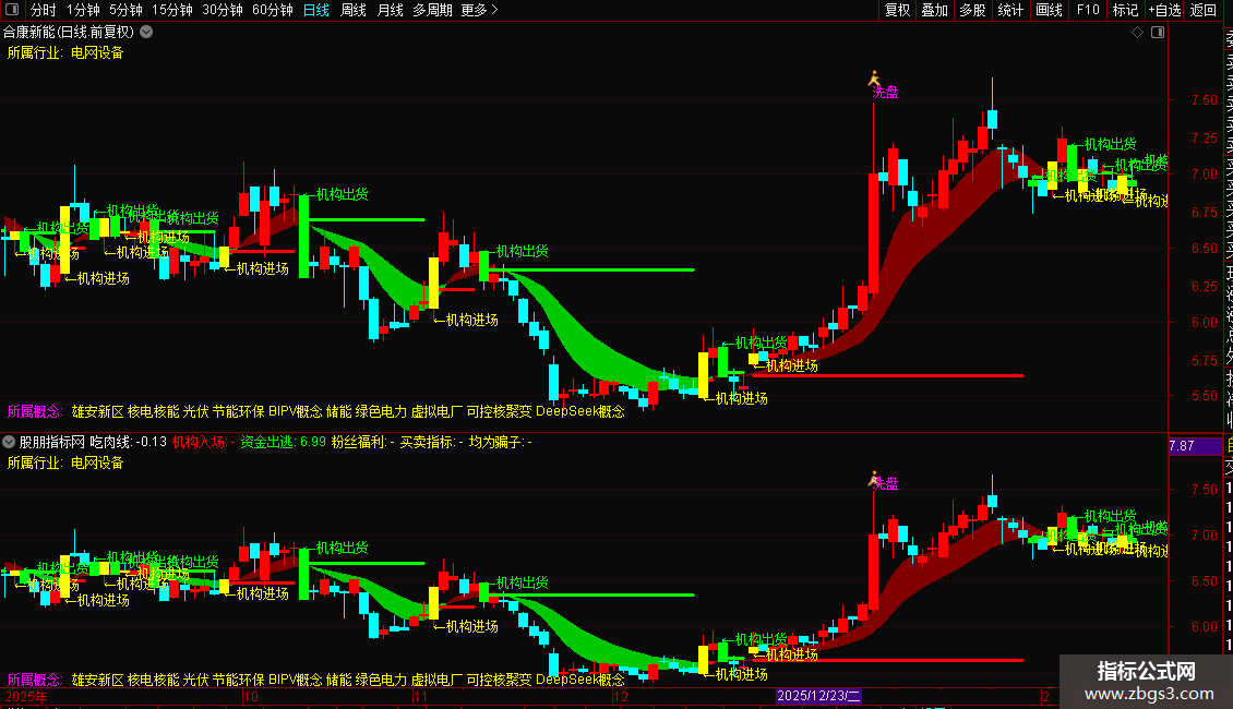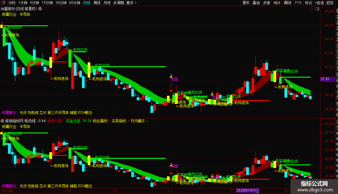 3. 机构资金动向:核心是`吃肉线`指标,它基于14日EMA的涨跌幅计算。当该线上穿零轴时,标记为“机构进场”信号(黄色K线);下穿零轴时,标记为“机构出货”信号(绿色K线),并在图表上标注文字提示。