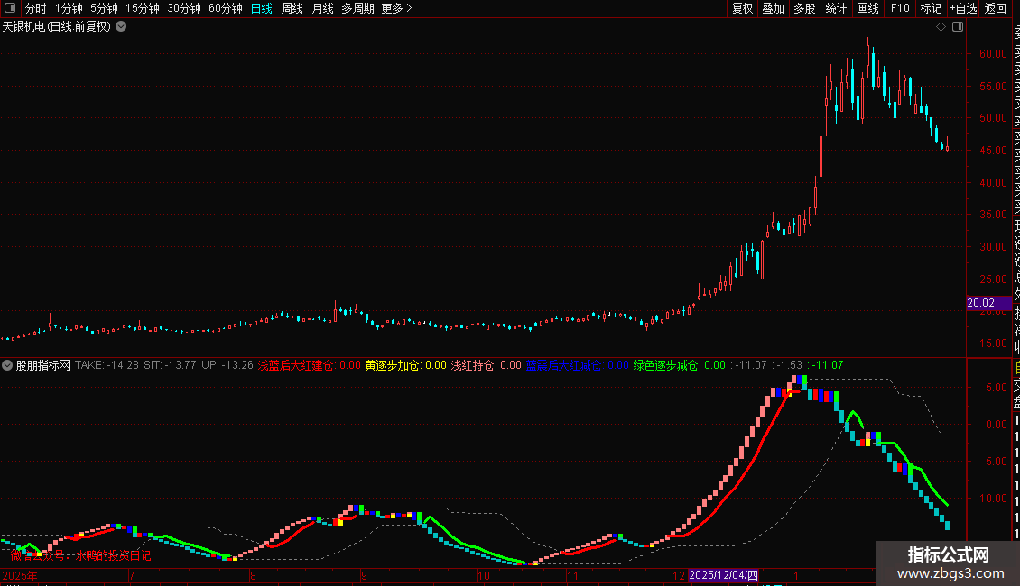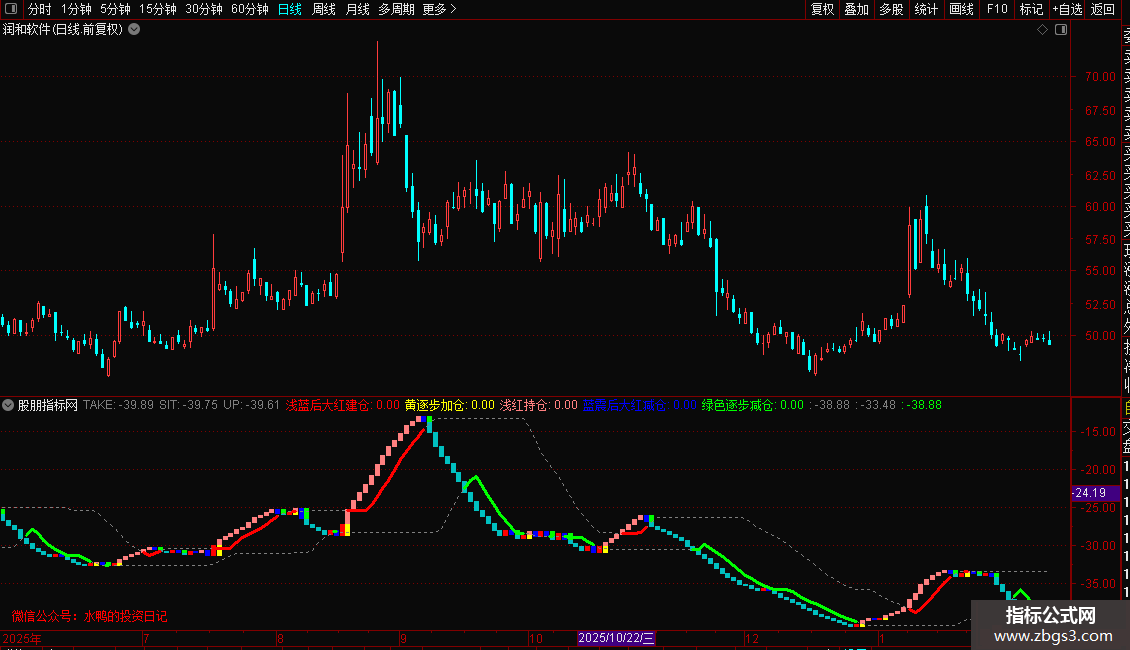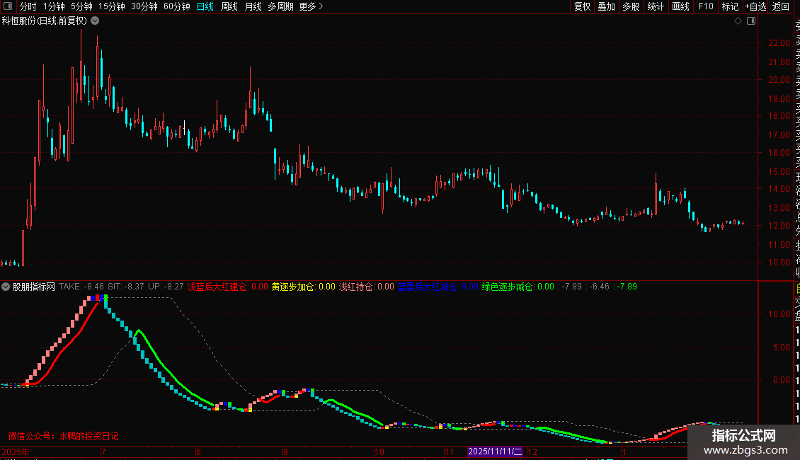 绿色柱:前一日出现UP下穿TAKE且当前UP高于TAKE,视为逐步减仓。