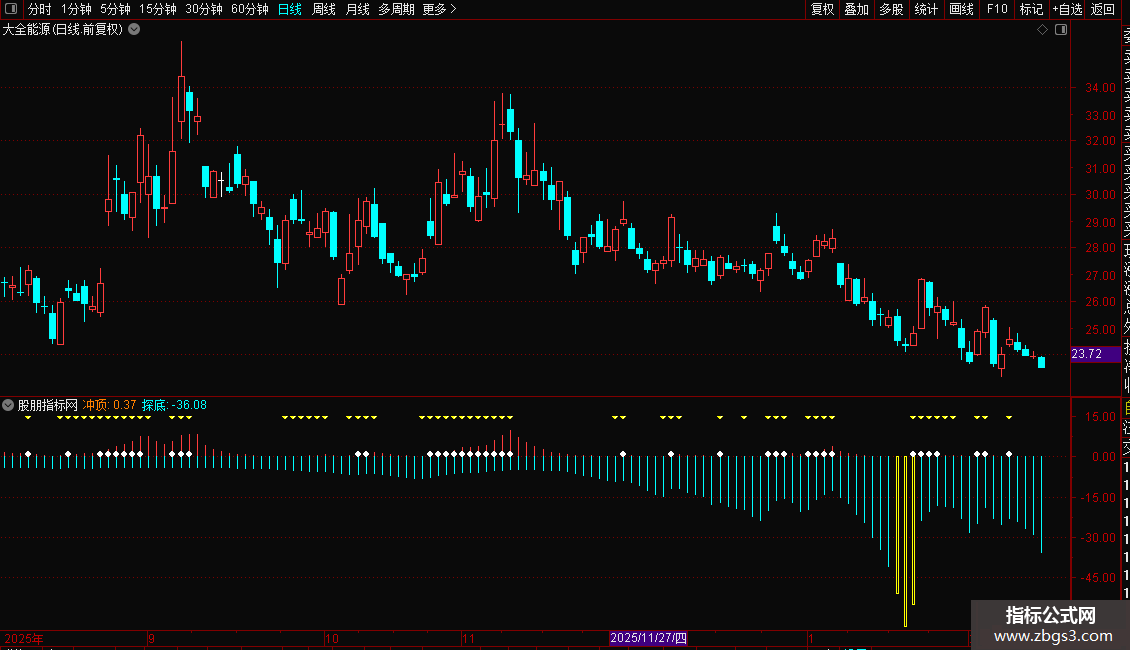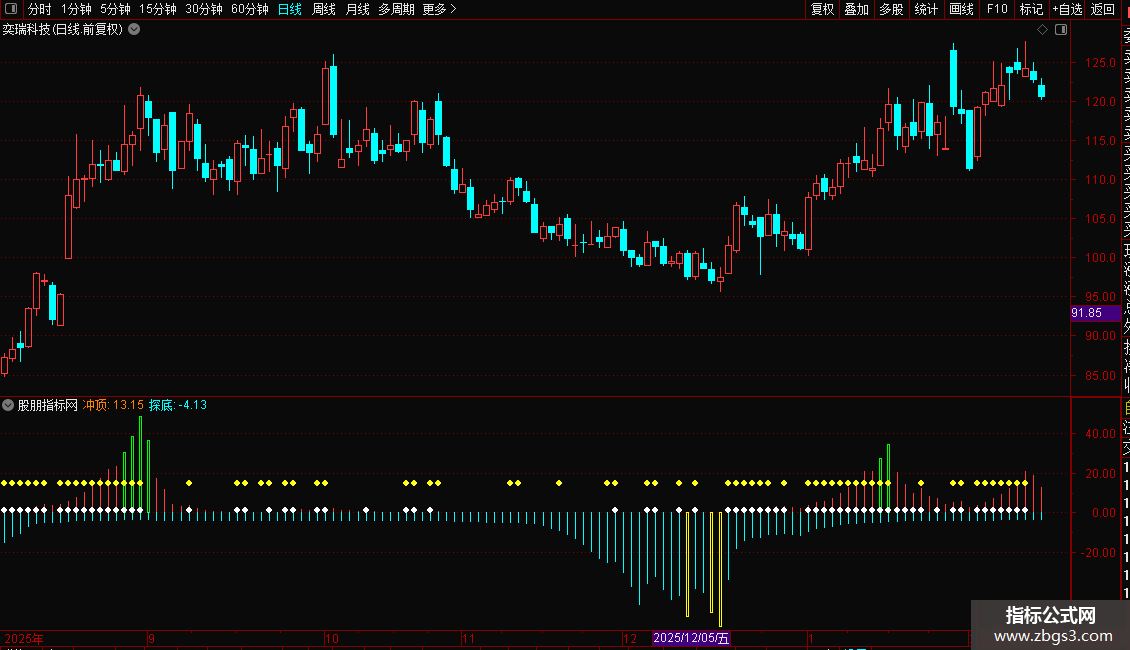 2. 探底:当数值降低(柱状图向下)时,表示股价接近近期(60周期)低点,存在反弹可能。黄色柱体提示超卖或探底信号。