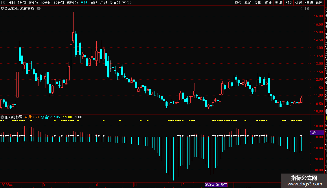 指标包含两个核心部分:“冲顶”线和“探底”线,分别用于衡量股价接近近期高点或低点的程度。它们以彩色柱状图(COLORSTICK)形式在主图或副图显示。