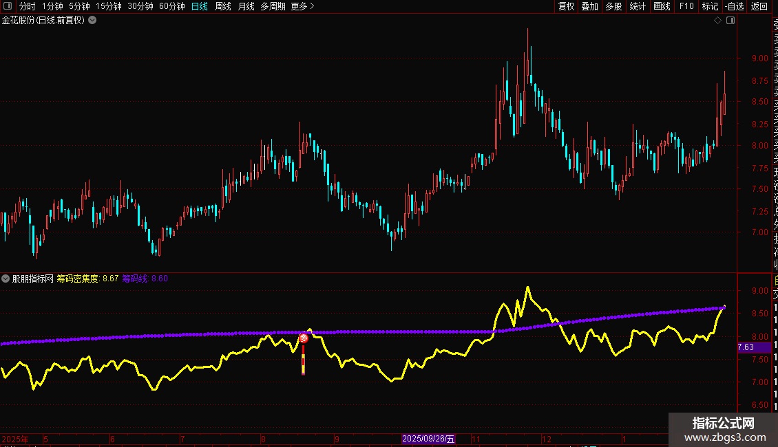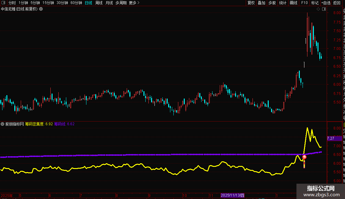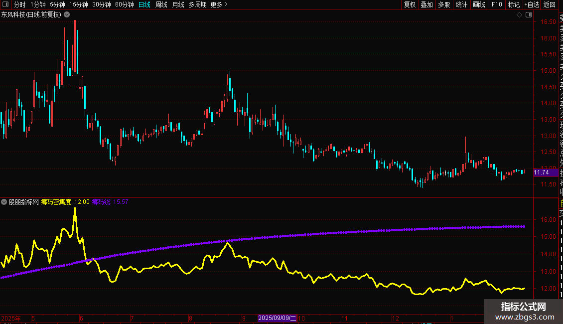 指标名为“筹码密集度”,主要用于分析市场筹码分布与价格关系。