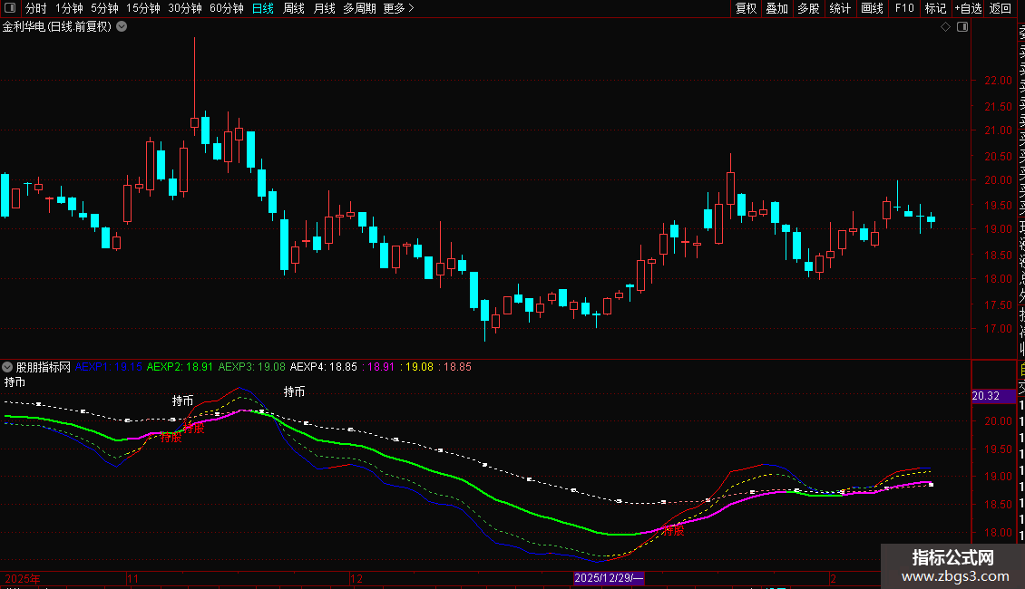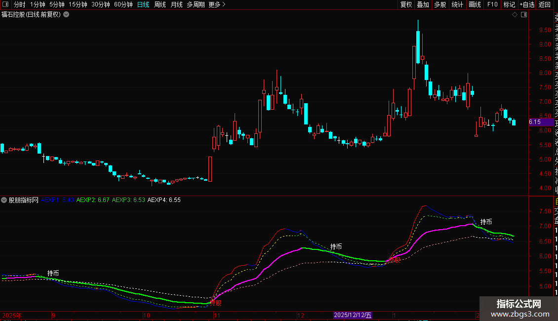 卖出信号:短期8日EMA上穿中期25日EMA时,标记“持股”,提示可能进入或处于多头行情。