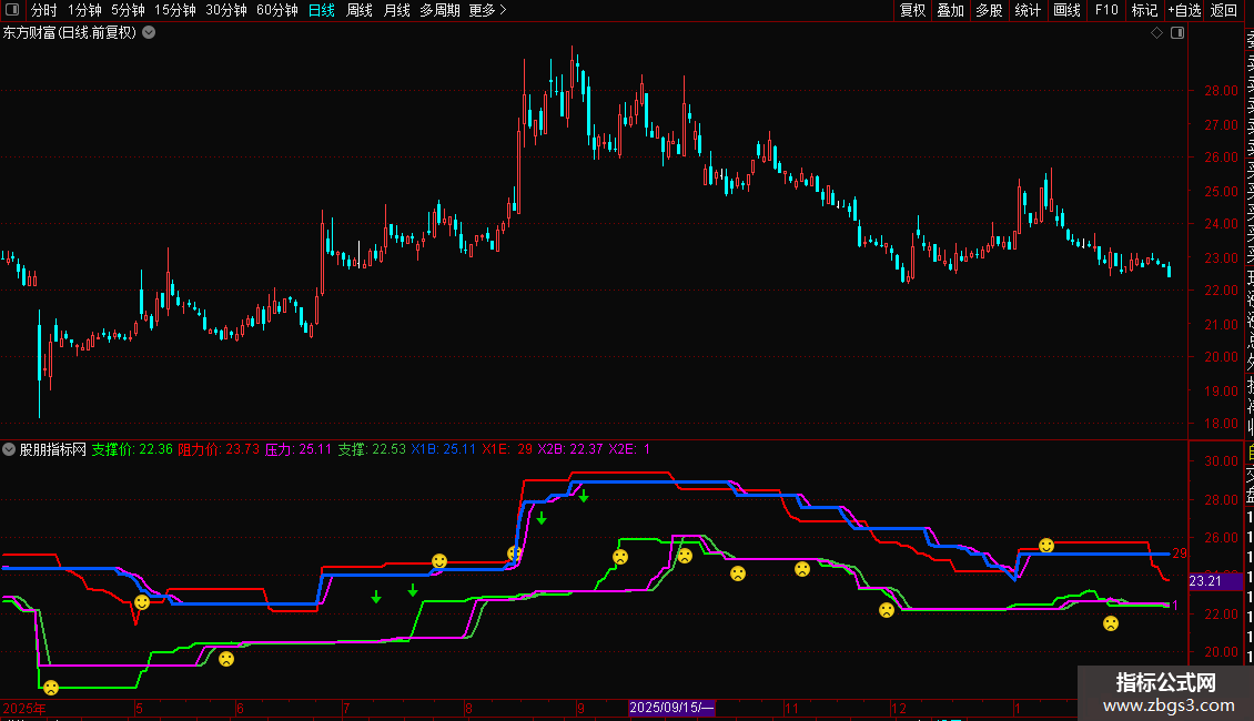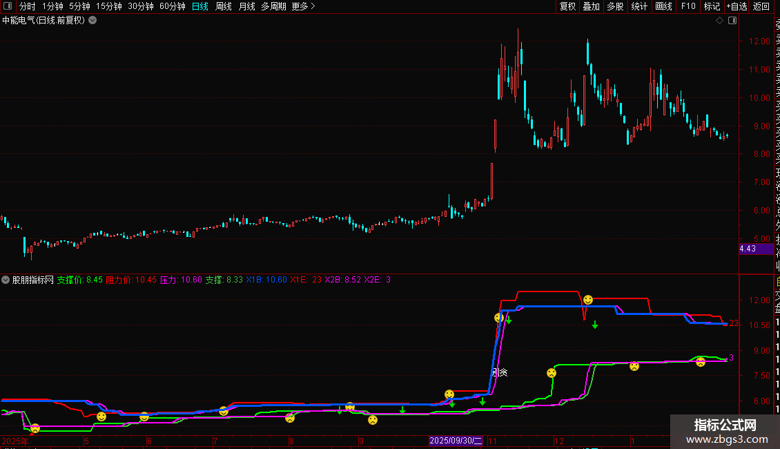 洋红色“压力”线与浅绿色“支撑”线构成中期参考。