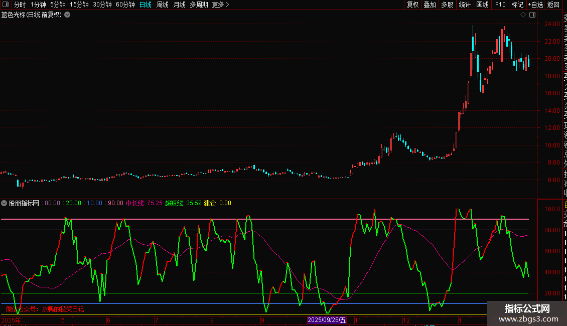 - 三条核心线:超短线(21周期)、短期线(4周期EMA)、中长线(34周期),均经算法调整至0-100区间。