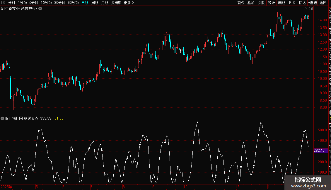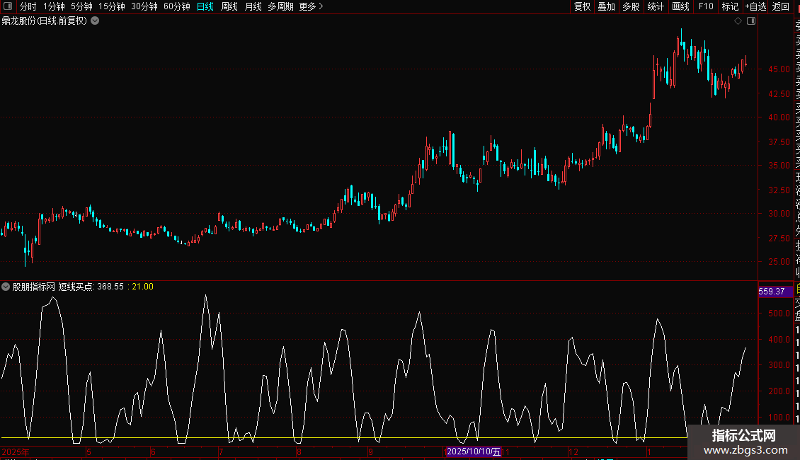 第一个公式计算一个名为“短线买点”的指标线,并在数值21处画一条水平参考线。指标通过衡量价格动量的强度变化来寻找潜在的短期买入时机。