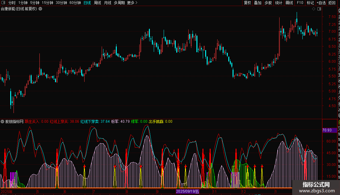 2. 跟庄买入:当随机指标J值上穿超卖阈值时,标记为红色粗线信号,提示可能的跟庄介入点。