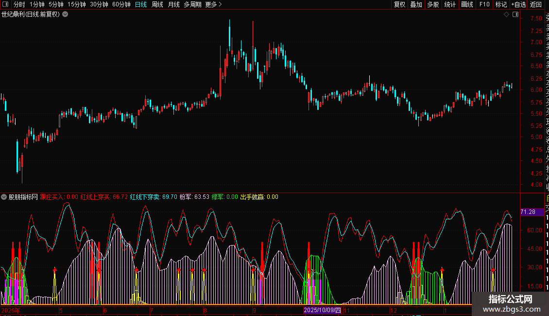 加载至副图,主要观察“出手就赢”的箭头图标信号和“跟庄买入”的红色粗线信号,作为重点参考。结合“吸筹”柱状图和“粉军”能量柱辅助判断趋势强弱。选股器用于批量筛选符合条件的股票。