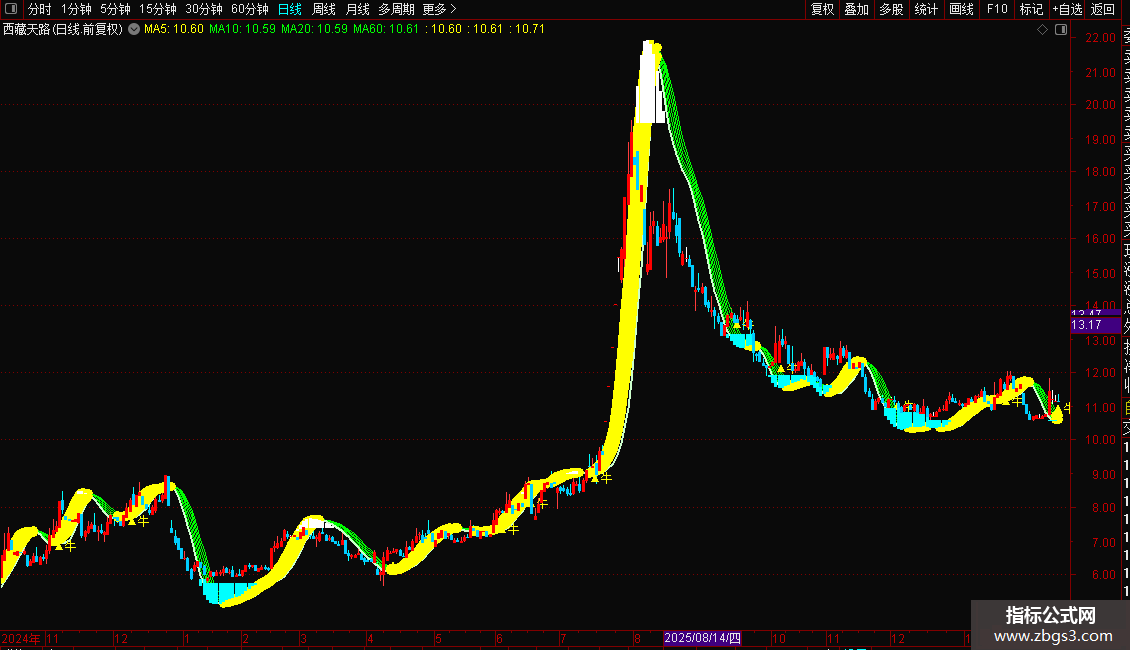 IF(雪山顶>下降,G2,DRAWNULL),COLORYELLOW,LINETHICK9;