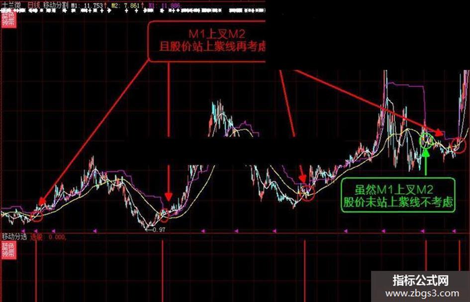 M1上穿M2,股价没有站上紫线的不考虑。当M1上穿M2后,不要急于介入,等股价站上紫线再考虑。股价并没有下破紫线平台,但紫线向下紧密靠拢黄线形成一个“金窝”,这是起爆前的“下蹲”(洗盘)。指标加密,不喜请绕行。
