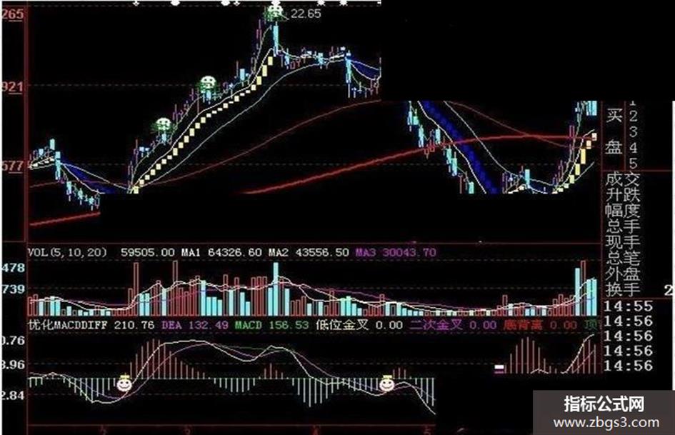 低位金叉:IF(CROSS(DIFF,DEA) AND DIFF<-0.1,0.3,0),COLORYELLOW,POINTDOT;