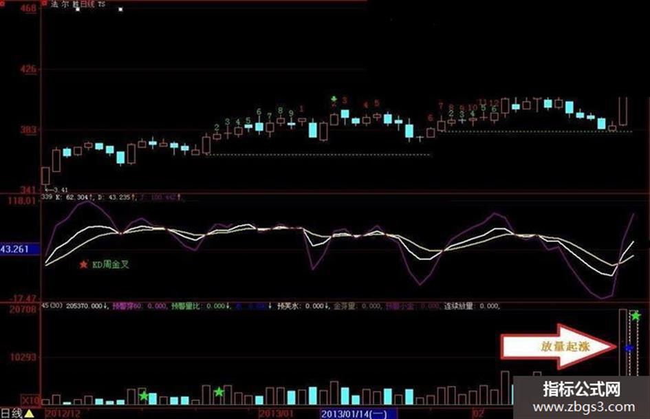 A1:=V=HHV(V,120); A2:=C/OPEN>1; TJ:=A1 AND A2; TJJ:=TJ AND (REF(BARSLAST(TJ),1)>80 OR BARSSINCE(TJ)=0); 放量起涨:if(TJJ,1,0),LINETHICK0; DRAWTEXT(TJJ,VOL/1.5,'★'),LINETHICK3,COLORBLUE;