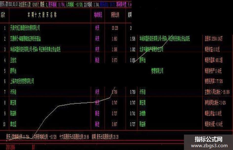 DRAWTEXTREL(5,35,'名次'),COLOR00FFFF;DRAWTEXTREL(120,35,'本 期 十 大 股 东 名 称'),COLOR00FFFF;DRAWTEXTREL(405,35,'增减情况'),COLORFF00FF;DRAWTEXTREL(478,35,'持股比例'),Color8080FF;DRAWTEXTREL(550,35,'前期比例'),colorwhite;DRAWTEXTREL(650,35, '前 期 十 大 股 东 名 称'),COLOR00FFFF;DRAWTEXTREL(880,35,'股票名称:'+'【'+STKLABEL+' '+STKNAME+'】'),COLOR00FFFF;