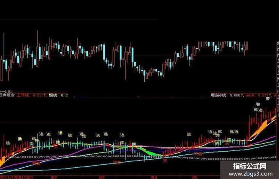 总趋势:EMA(EMA(EMA(EMA(EMA(CLOSE,65),3),3),3),3),LINETHICK2,colorblue;