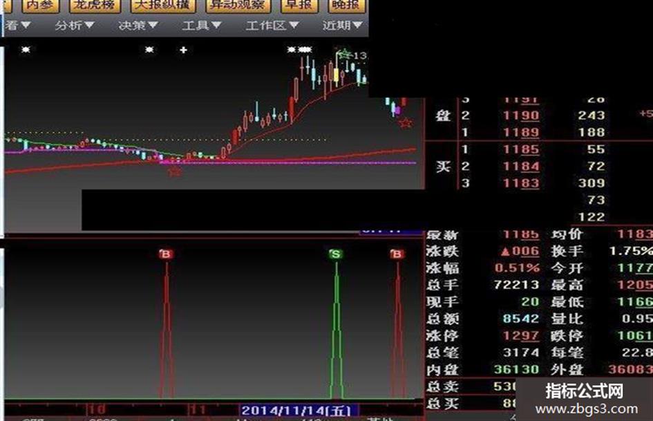 本指标是未来函数,作买卖点参考是否有用?贤者见贤。 DRAWGBKLAST(v>1,STRIP(RGB(00,0,0),RGB(90,90,90),0)); 买入:CROSS(ZIG(3,8),REF(ZIG(3,8),1)),colorred; 卖出:CROSS(REF(ZIG(3,10),1),ZIG(3,10)),colorgreen; DRAWBMP((买入> 0),1.1,'B.bmp'),ALIGN1; DRAWBMP((卖出> 0),1.1,'S.bmp'),ALIGN1;